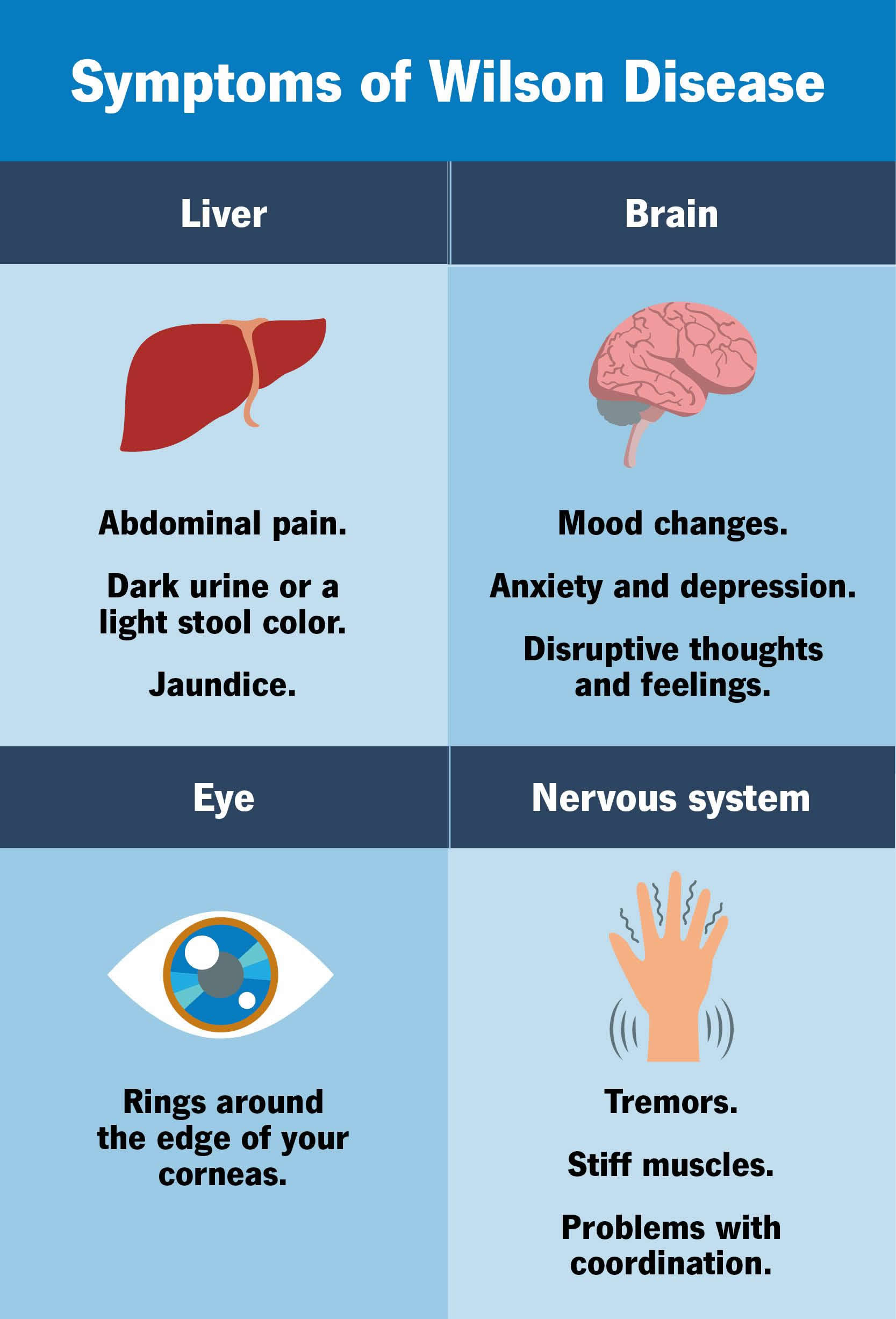 Wilson disease, without early diagnosis and treatment, can lead to life-threatening complications. Toxic levels of copper build up in your body, especially in the liver and brain, and put you at risk of organ damage. Increased copper levels will affect how you feel, often making you very tired or weak and uncomfortable or in pain. If you have weakness, tiredness or pain that doesn’t go away, reach out to your healthcare provider for advice.