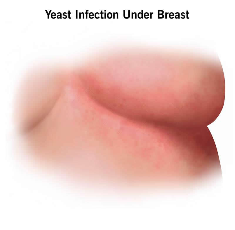 Yeast infections under your breasts are a common fungal infection caused by a yeast called Candida. Symptoms include a bright red rash under your breasts and on your upper torso. Treatment includes the use of an antifungal cream or ointment. You can prevent yeast infections by using a drying powder under your breasts.