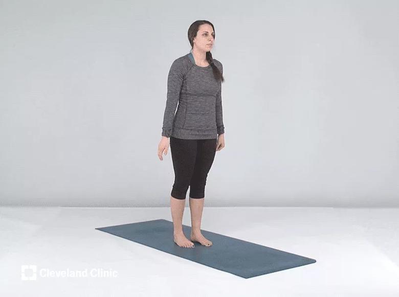 This standing pose puts more focus on your thighs and ankles, while demanding a bit more from your core muscles. While challenging, this pose requires a lot of focus and follow-through. Hold this pose as long as you can. For an added challenge, sink deeper into “your seat” while remaining standing.