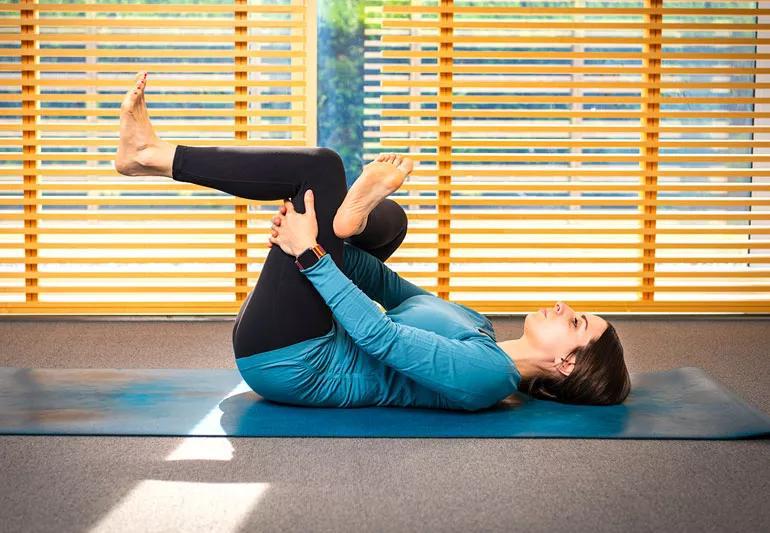 - Bring your legs toward your chest and hold your bent leg with your hands.