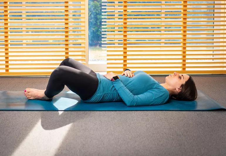 - From a sitting position, lie on your back, knees bent.