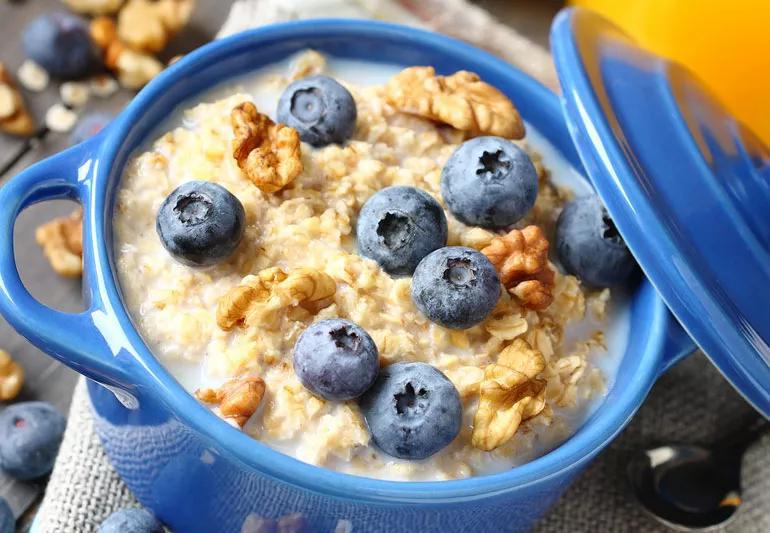 Breakfast: ½ cup oatmeal, ½ cup blueberries, 1/4 cup walnuts.