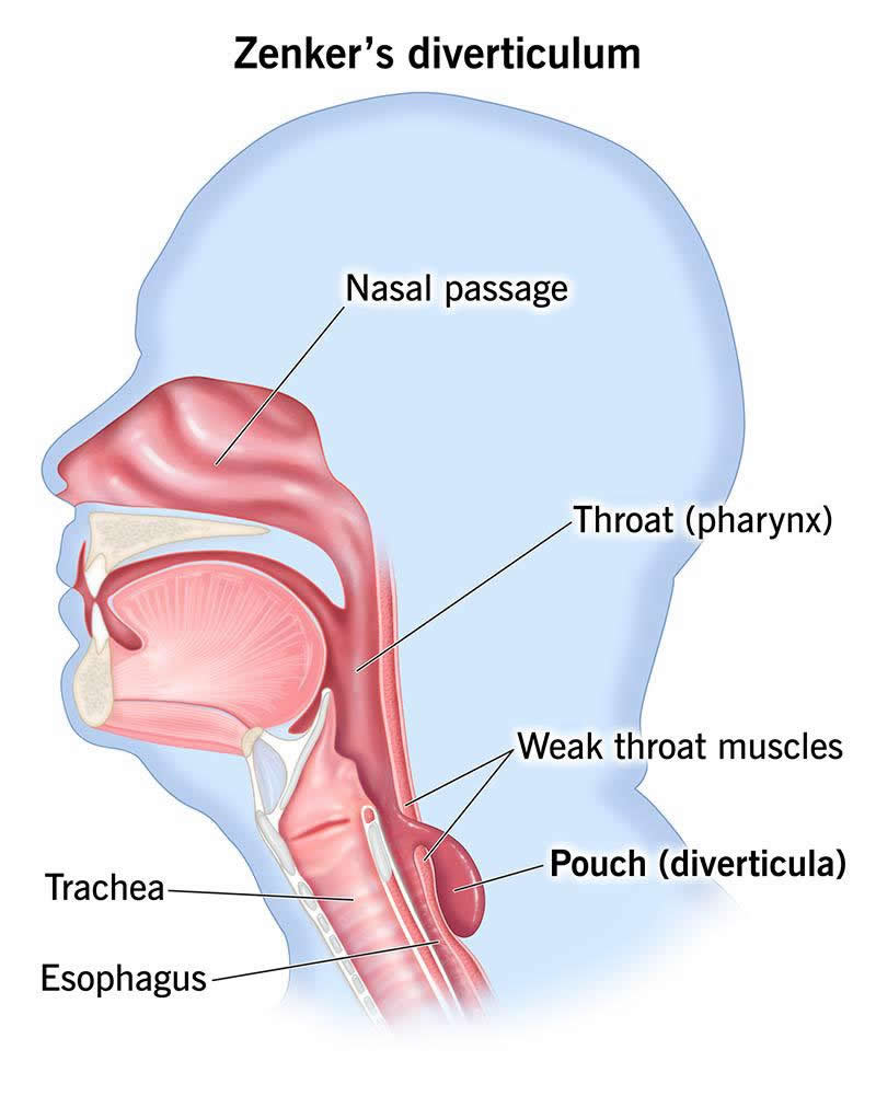 Zenker’s diverticulum is a pouch that forms at the top of your esophagus, so it’s hard to swallow. The condition happens when a muscle at the top of your esophagus (cricopharyngeus muscle) doesn’t relax to let food move into your esophagus. Symptoms include food regurgitation and bad breath. Treatment is surgery to remove or fix the pouch.